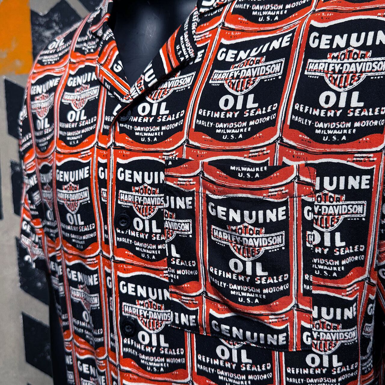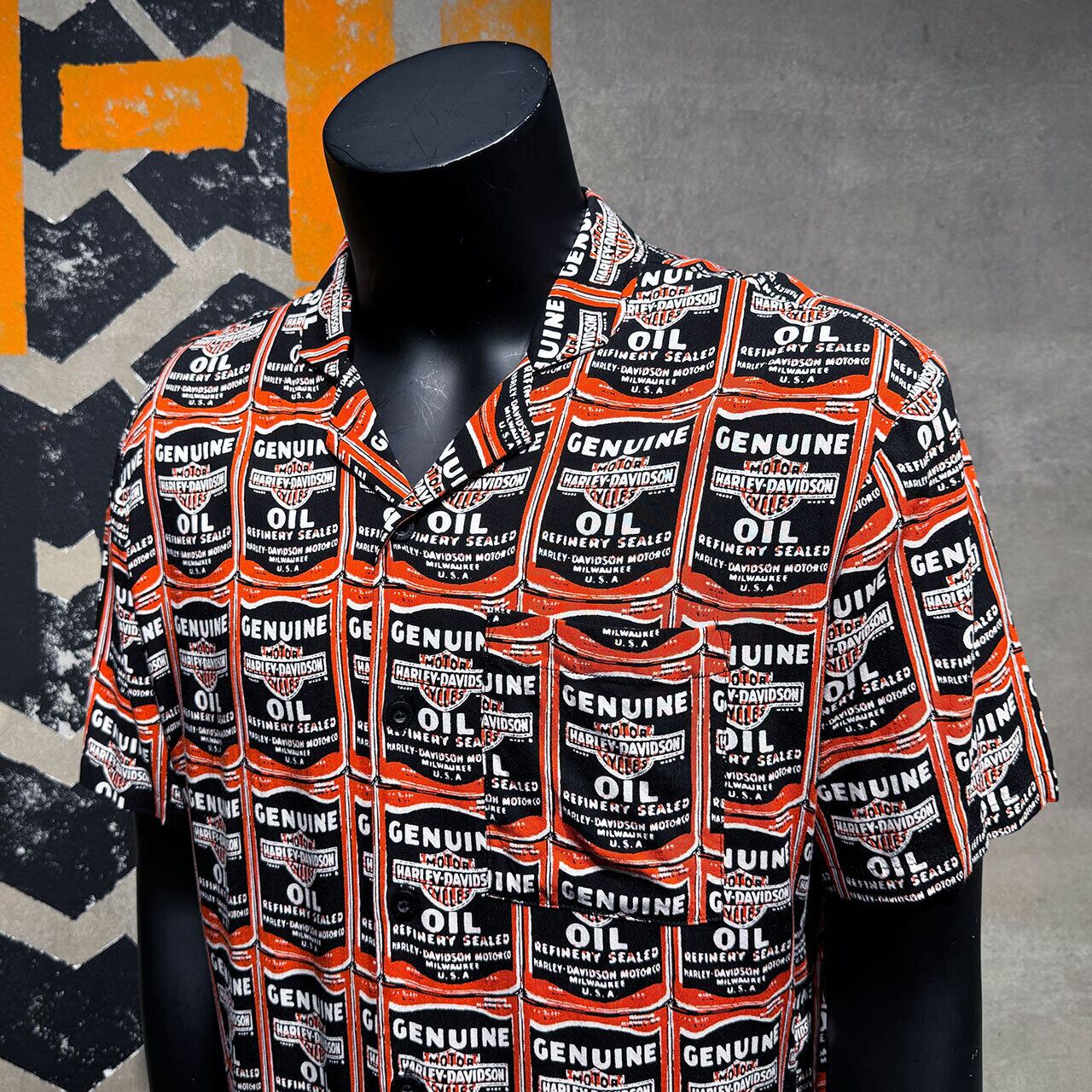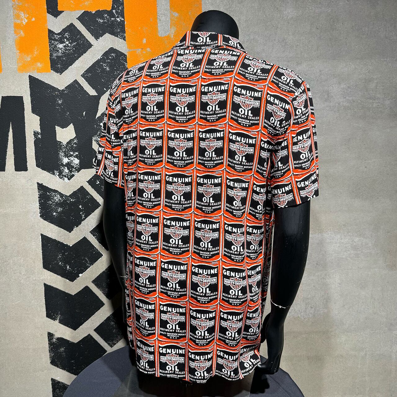 Harley-Davidson ハーレー 半袖 シャツ アロハ 開襟 オイル缶 総柄