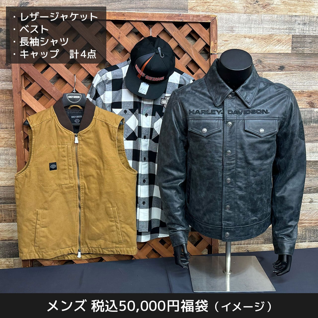10万円相当のレザージャケットのほか、ベストやシャツ、キャップが入って税込み5万円という、最高にお得な福袋。中身は届いてからのお楽しみ...!(掲載写真はサンプルです)