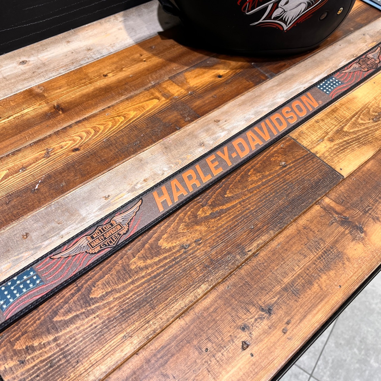 太字のハーレーダビットソンスクリプトとクラシックな翼のバー&シールドロゴ、そしてアメリカ国旗のグラフィックがエンボス加工されています。
