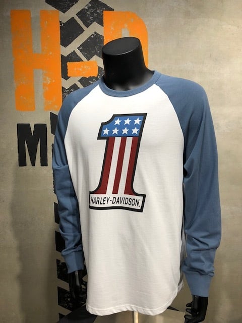 ハーレーでは珍しいブルーカラーに人気のナンバーワンロゴがあしらわれたTシャツ。