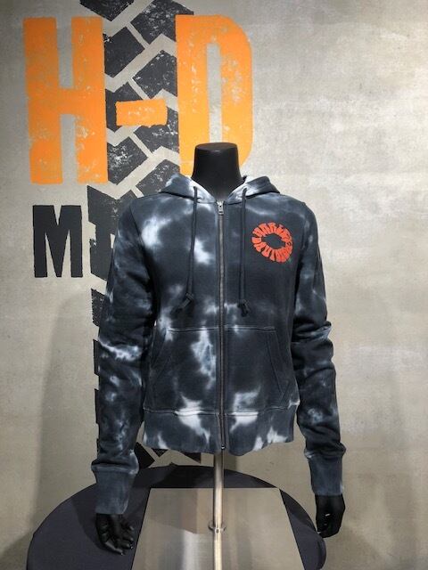 絞り染め風タイ・ダイ柄にオレンジのロゴが印象的なフーディー。