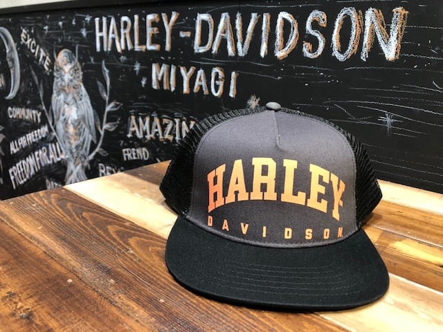 オレンジのプリントロゴがあしらわれたメッシュタイプのキャップです。