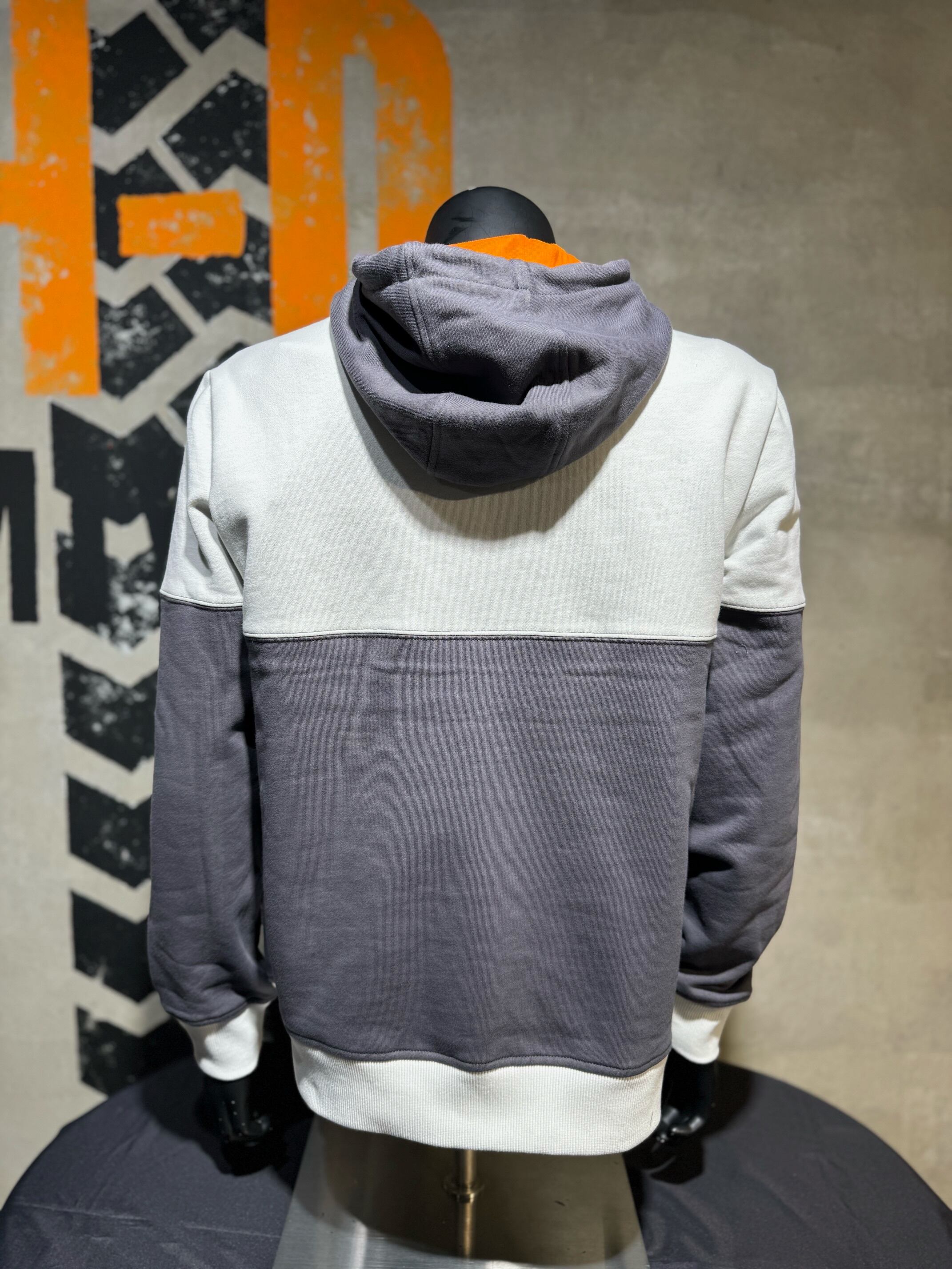 ホワイトとグレーのシンプルな色使いに、差し色でフードの中などにオレンジが使われています。